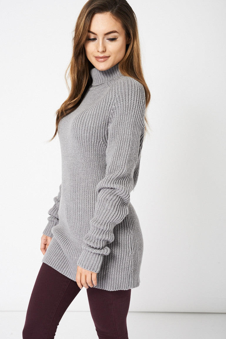Grey High Neck Knitted Jumper Key Features Include: - Grey Colour - High Neckline - Long Sleeves - Stretchy Material Material: - 100% Acrylic Approx. Measurements: Model is 5' 7" and wears a size S - Chest across one side 41cm - Length from shoulder to hem 77cm