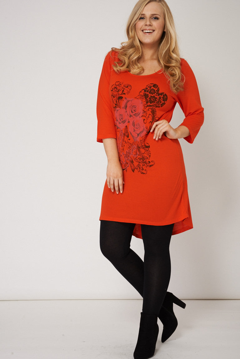 Orange Top With Floral And Love Print Key Features Include: - Black Floral Front Print - Round Neckline - 3/4 Sleeves - Soft Touch Stretchy Material Material: - 50% Cotton - 50% Modal Measurements: - Model is 5' 7" and wears size UK16 - Chest across one side approx. 46cm - Length from shoulder to front hem 92cm - Length from shoulder to back hem 102cm