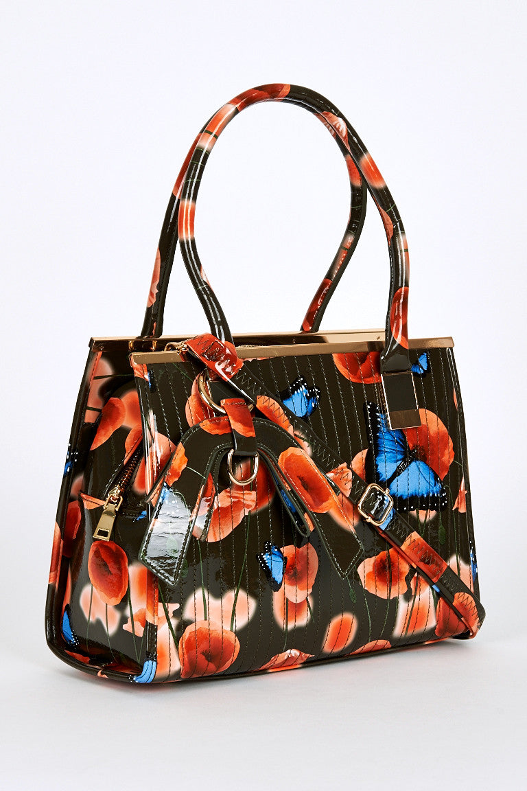 Patent Butterflies And Poppies Print Handbag Key Features: - Glossy Patent Partly Rigid Bag - Butterflies And Poppies Print Allover - Top Zip Fastening Decorative Bow And Stitch Details - Grab Handle Detachable And Adjustable Shoulder Strap Material: - Patent Faux Leather - Synthetic Material Approx. Measurements: - Width 31cm - Height 24 cm - Depth 12cm