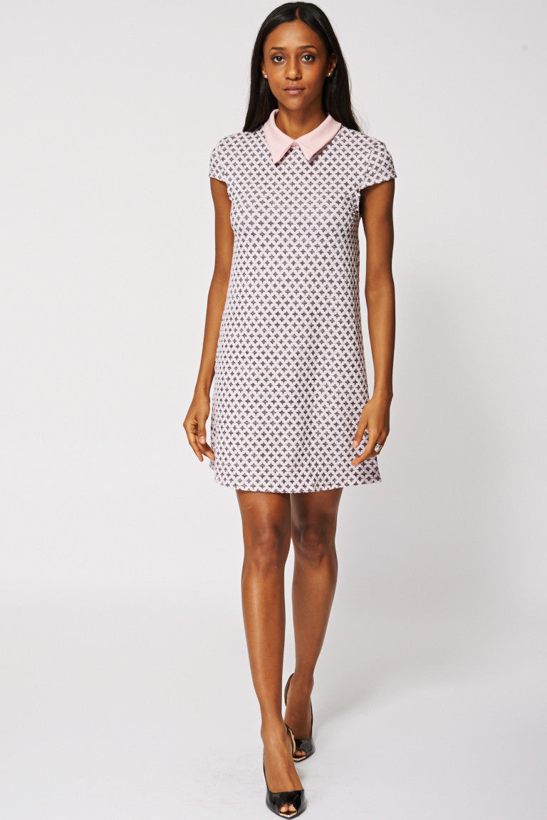 Patterned Pointed Collar Shift Dress In Pink Key Features Include: - Baby Pink Pointed Collar - Double Button Closure With Keyhole At The Back - Cap Sleeves - Cute Textured Relaxed Fit Dress Material: - 54% Polyester - 42% Viscose - 4% Elastane Measurements: Model is 5' 7" and wears a size UK8 - Chest on one side approx. 42cm - Length from shoulder to hem 84cm