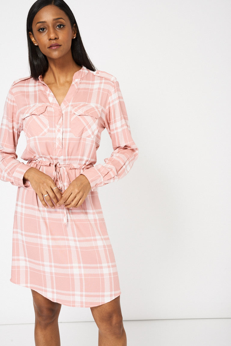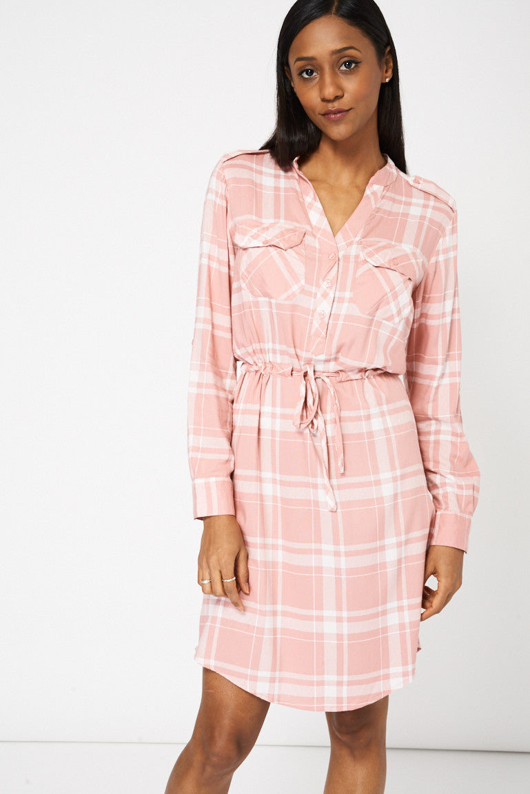 Pink Drawstring Waist Shirt Dress Ex-Branded This is an ex-branded item therefore the labels will be cut Key Features Include: - White And Pink Colour - Long Sleeves - Two Front Pockets - Drawstring Waist - Rounded Hemline - Soft Material Material: - 100% Viscose Approx. Measurements: - Model is 5"7' and wears a size UK8 - Chest across one side 48cm - Length from shoulder to hem 91cm