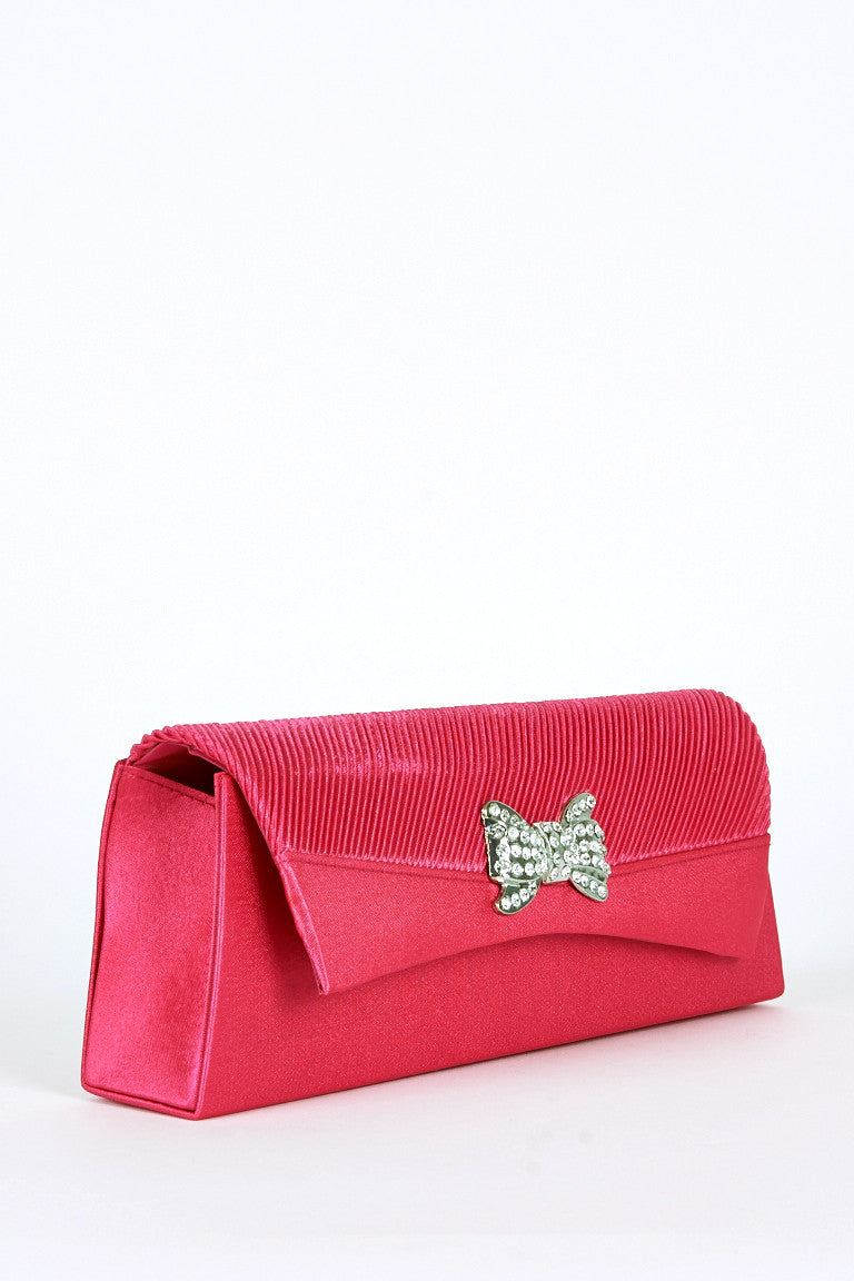 Pleated Top Panel Diamante Bow Detail Clutch Bag Available In Teal And Pink Key Features: - Decorative Silver Colour Bow With Diamante - Magnetic Snap Closure - Detachable Shoulder Chain Strap - Soft Touch Elegant Bag Material: - 100% Polyester Measurements: - Width 25cm - Height 9.5cm - Depth 4.5cm