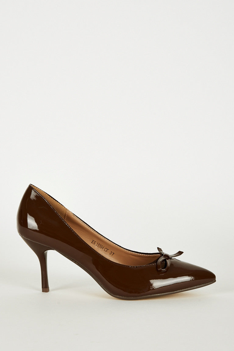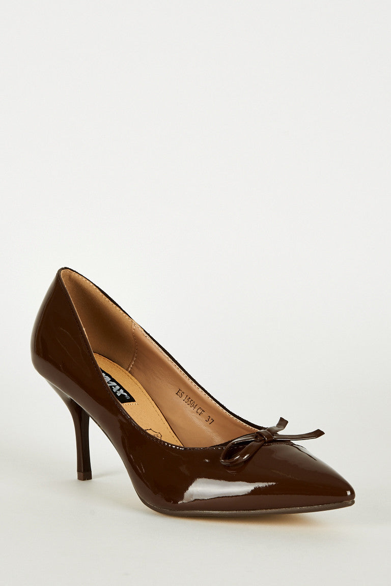 Pointed Toe Panel Court Shoes In Brown Key Features Include: - Suedette And Patent Panels - Pointed Toe - Half Bow Front Detail - Slim Heel Elegant Shoes Material: - Faux Suede - Faux Leather - Leather Insole Measurements: - Heel Height 8cm