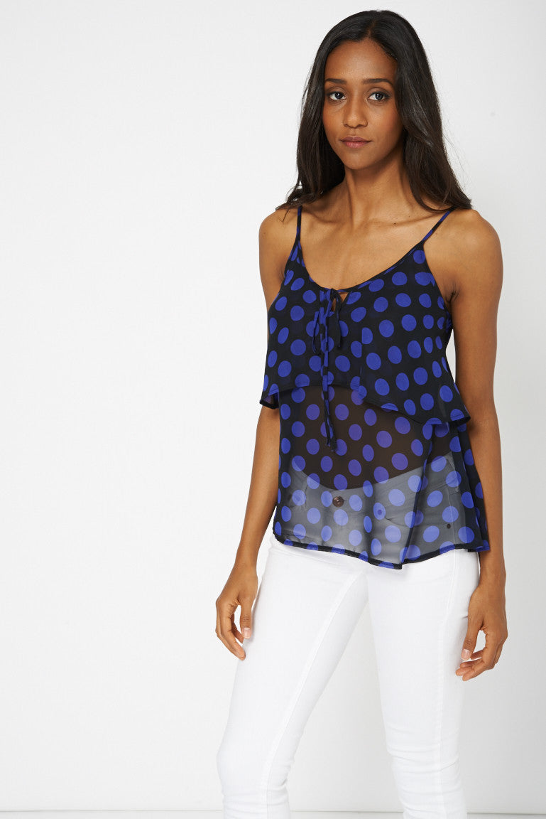 Polka Dot Frill Camisole Top Ex-Branded this is an ex-branded item and will have the labels cut out Key Features Include: - Front Overlay - Adjustable Spaghetti Straps - Sheer Relaxed Top Material: - 100% Polyester Measurements: Model is 5"7' and wears a size UK8 - Chest across one side approx. 42cm - Length from shoulder to hem approx. 59cm