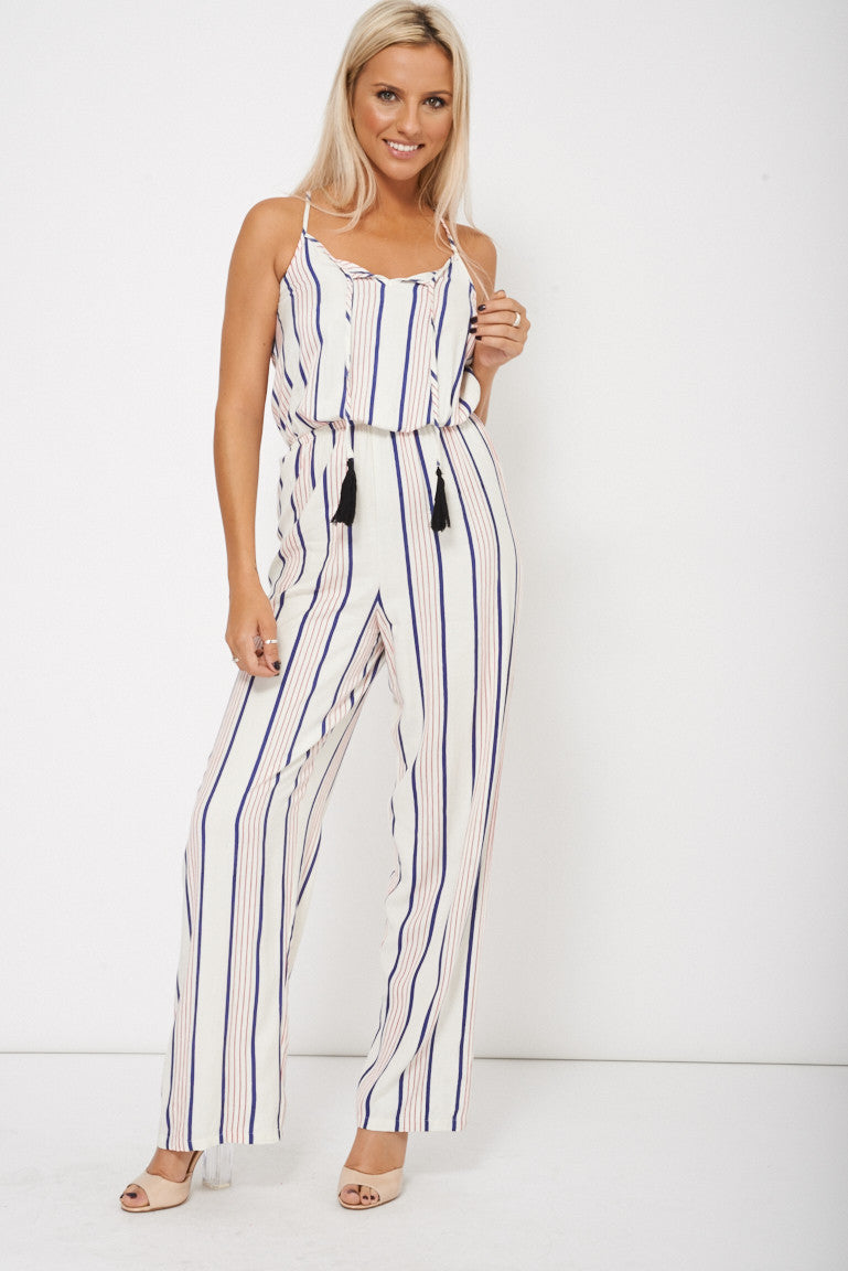 Pom Pom Detail Stripe Jumpsuit Ex-Branded This item is ex-branded and will therefore have the labels cut Key Features Include: - Spaghetti Shoulder Straps - Round Neckline - Pom Pom detail - Comfy Stretchy Jumpsuit Material: - 100% Cotton Measurements: - Model is 5' 7" and wears a size UK6 - Chest on one side approx. 38cm - Inside leg approx. 79cm - From shoulder to hem 152cm
