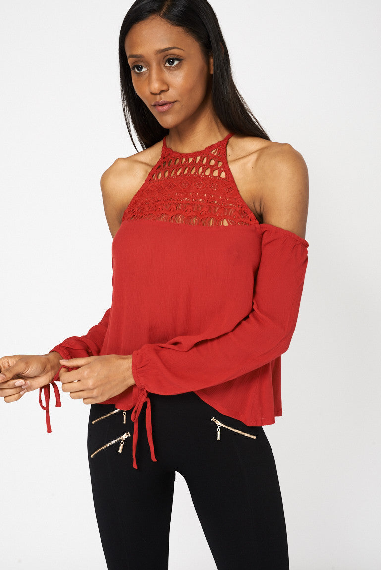 Red Lace Detail Cold Shoulder Top Key Features Include: - Red Colour - Lace Detail - Back Button Fastening - Long Sleeves Material: - Shell: 100% Viscose - Lace: 100% Polyester Approx. Measurements: - Model is 5'7" and wears a size UK8 - Chest across one side 41cm - Length from shoulder to hem 56cm
