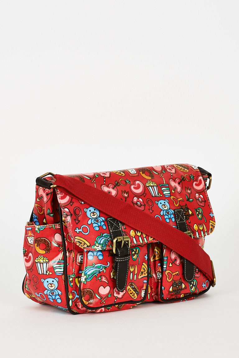 Red Printed Zip Fastening Satchel Bag Key Features: - Two Front Poppas - Internal Top Zip Fastening - Two Front Pocket - Internal Pockets - Lined - Adjustable Shoulder Strap - Back Zip Compartment Material: - Synthetic Approx. Measurements: - Width 33cm - Height 25cm - Depth 12cm