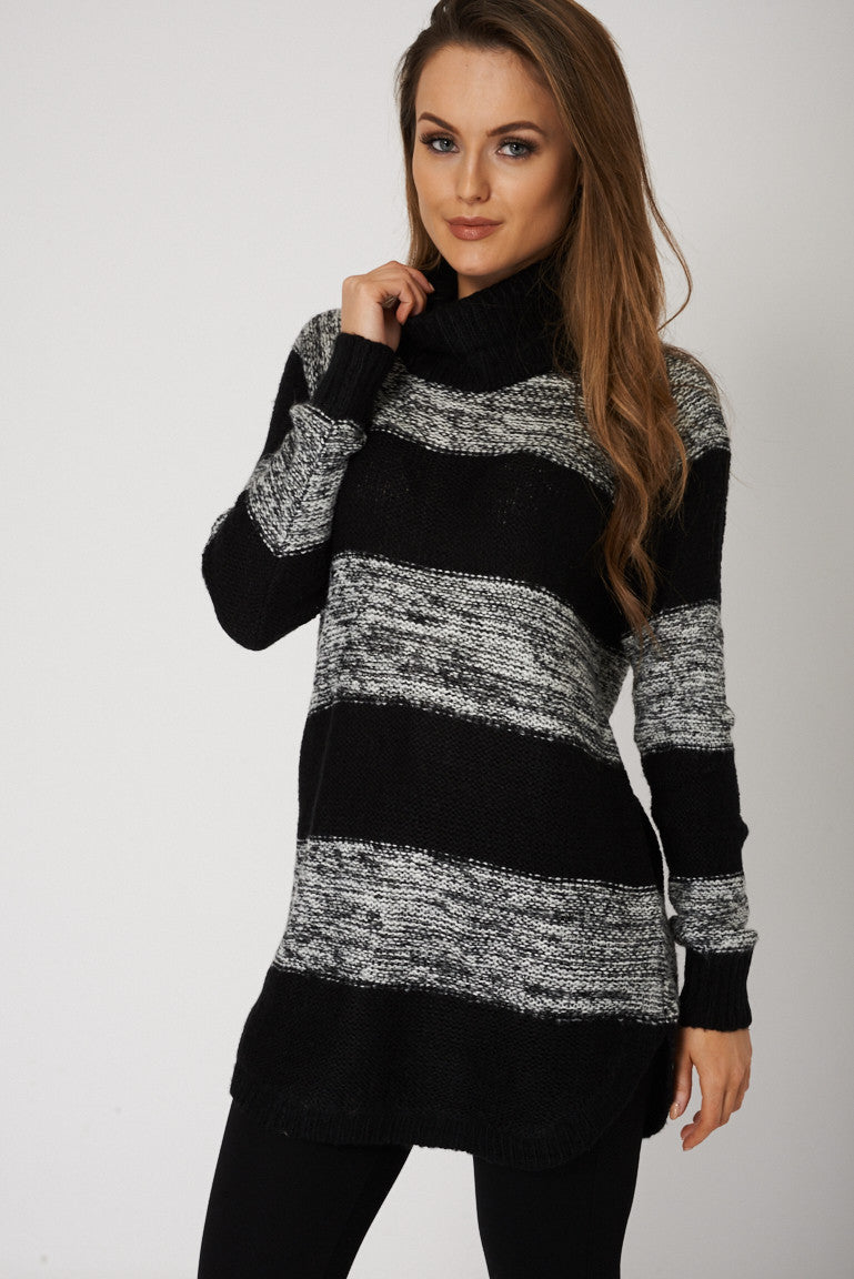 Roll Neck Striped Curved Hem Jumper Key features: - Ribbed Neck Hem And Cuffs - Comfy Loose Fit - Curved Hem Material: - 100% Acrylic Measurements: Model is 5' 7" and wears a size Extra Small - Chest across one side approx. 46cm - Length from shoulder to hem approx. 76cm