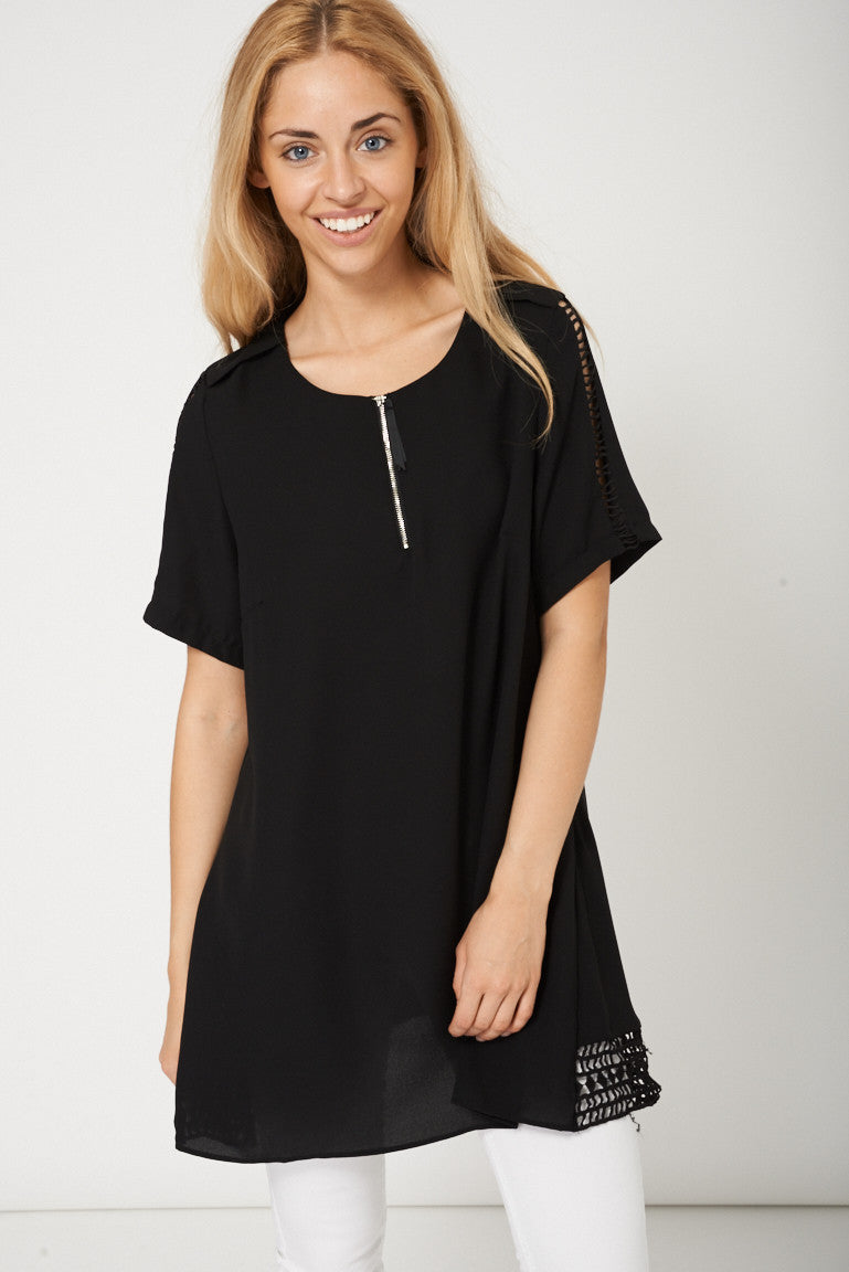 Sassy Black Midi Dress With Cut Out Fabric Design Key Features Include: - Short Sleeve - Round Neck - Textured Material - Back Zip Material: - 100% Polyester Measurements: - Model is 5'7" and wears a size Extra Small - Chest across one side Approx. 49cm - Length from shoulder to hem 75cm