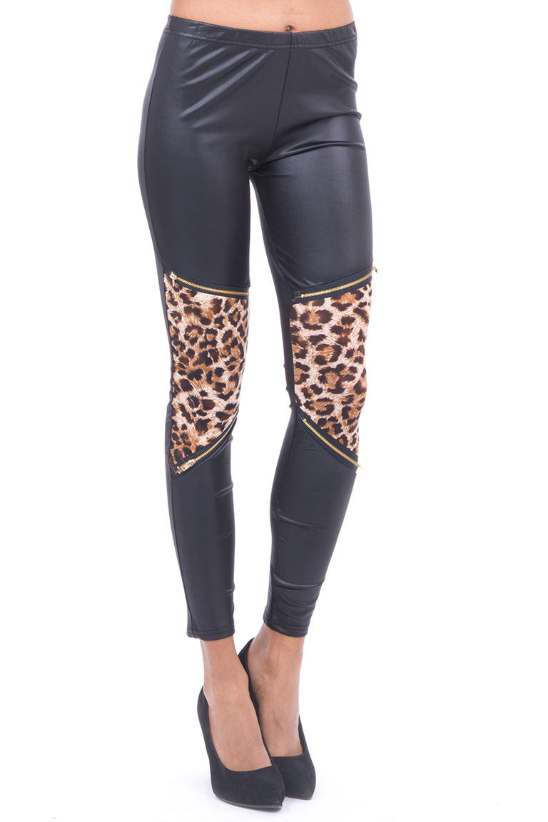 Satin Look Leggings with Leopard Print Detail. These leggings have a slanted leopard print panel at the knee with open-able zips above and below. Ideal for a night out with a little black top. Material: 85% Polyamide 15% Elastane Approx measurements for size S/M: Waist 31cm stretching to 43cm Length from waistband to ankle 89cm